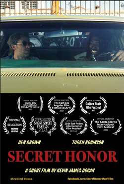 Secret Honor starts off as a hang-out movie between two buddies – Demarcus (Turen Robinson), a hot young comic, and Victor (Ben Brown), a tough ex-boxer. They’re eating tacos, shooting the breeze, waiting to pick up some Laker tickets from Demarcus’s friend. When the identity of his friend is revealed, a laid-back afternoon in LA turns into a grim, comic standoff between old foes. A matter of life and death becomes a matter of true honor in the age of social media.